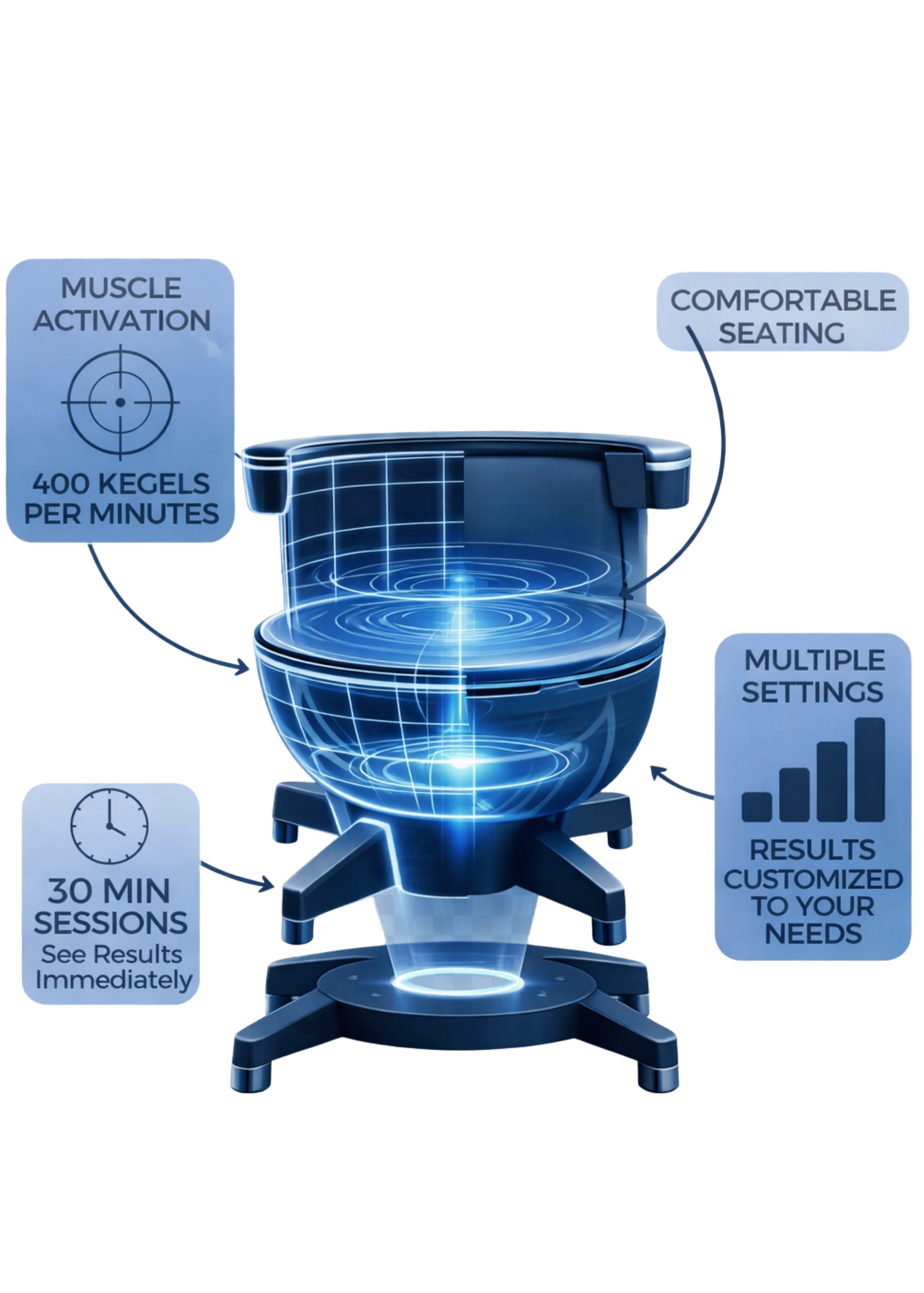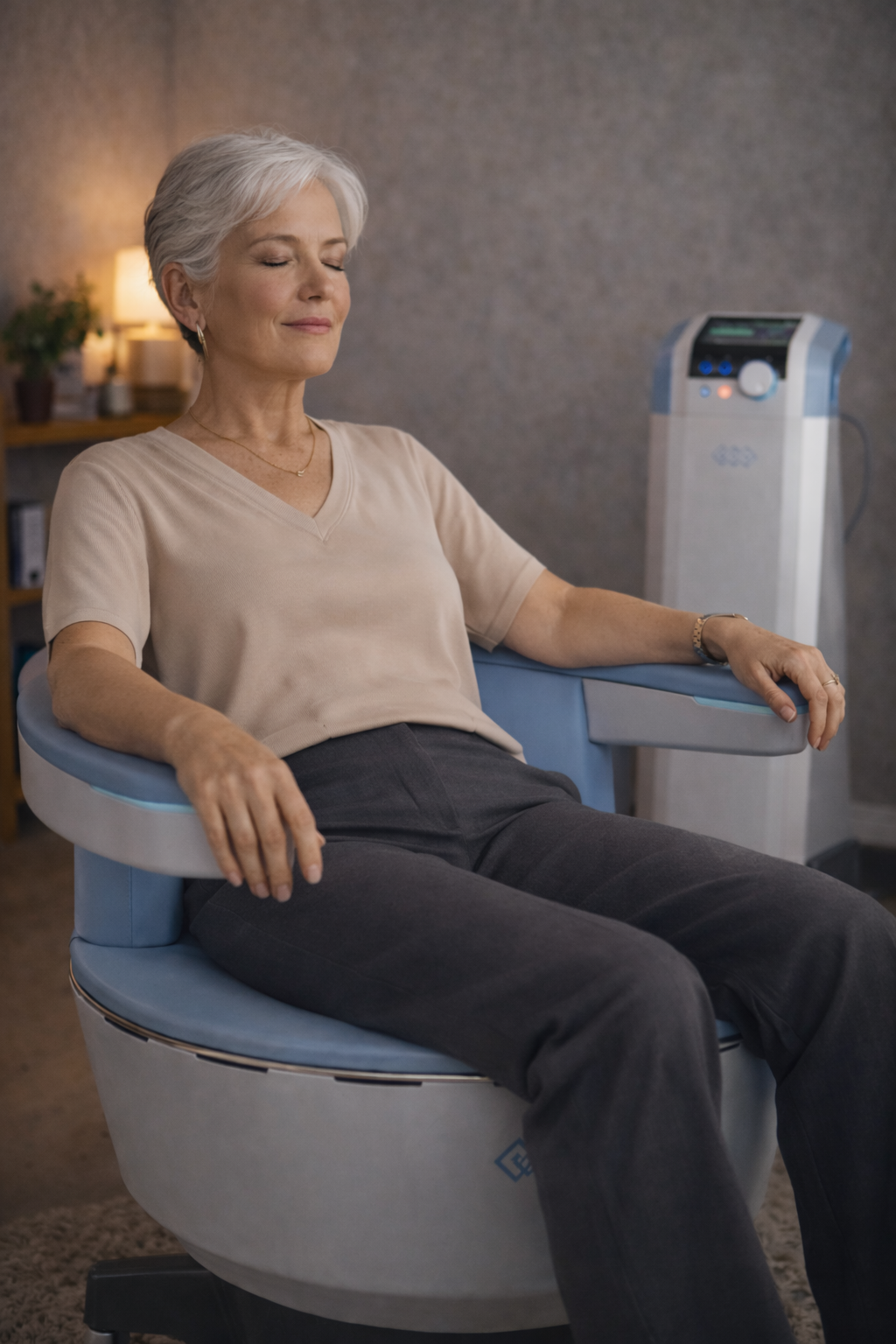You stay fully clothed and simply sit down in the chair while the session begins. As it starts, you will feel a series of deep pelvic floor contractions, similar to a workout happening without you having to think about it. It is not painful, but it can feel unfamiliar at first as the muscles engage and release. Most people quickly settle in, scroll on their phone, or relax as the session continues. By the end, it often feels much easier than expected, and you can get up and return to your day right away with no downtime.